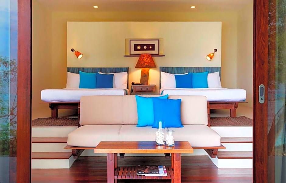Featuring lagoon and ocean views, this spacious two-bedroom villa comes with a veranda and private plunge pool.